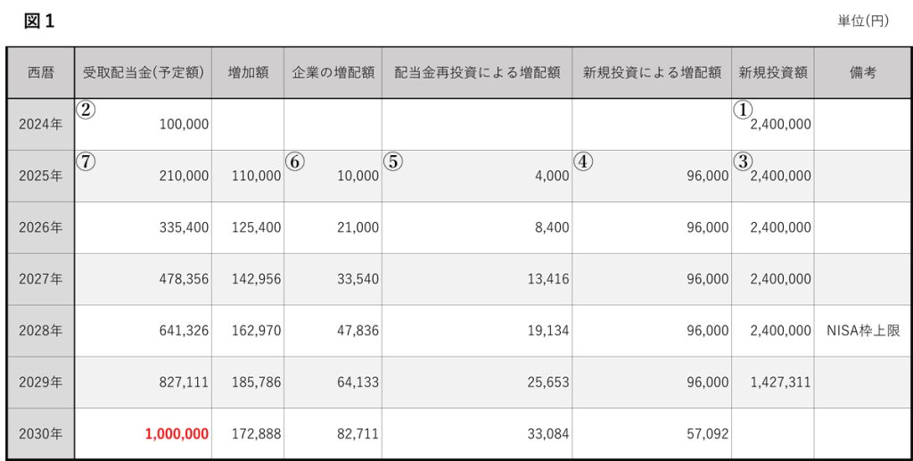 それ以降は同様のプロセスを経ることで、受取り配当金は図1のような推移となり、目標となる配当金100万円/年は2030年に達成されると見積もっています。